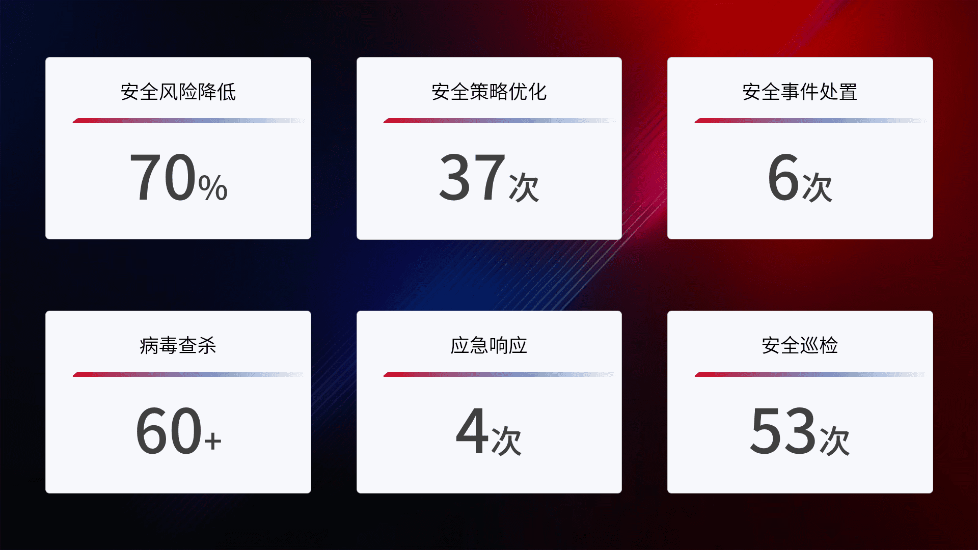 提供全面的安全事件报告体系,,包括处置报告、、、、周报、、、、季度和年度总结,,,结合持续监控,,帮助客户深入了解网络安全状况。。。